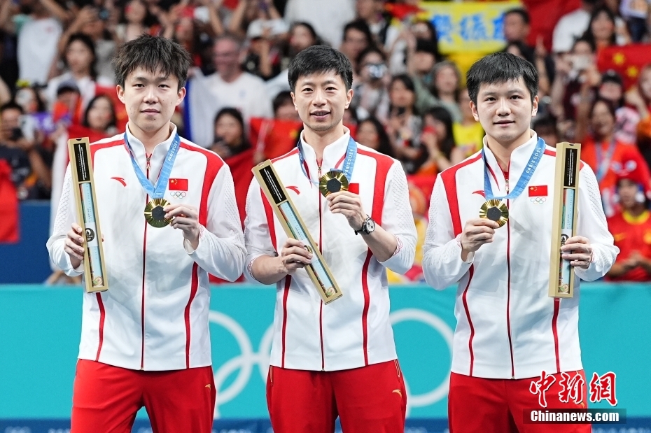 在巴黎奧運會(hui) 乒乓球男團金牌賽中,中國隊以3比0戰勝瑞典隊,獲得冠軍(jun) 。中新社記者 趙文宇 攝