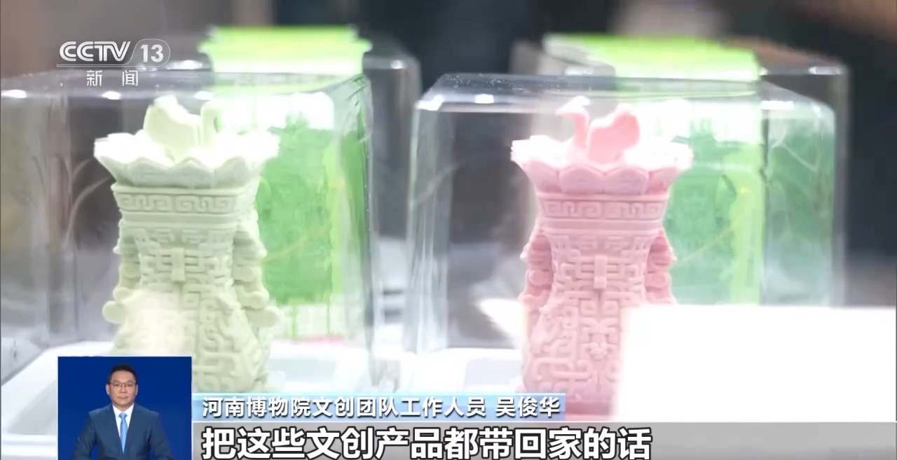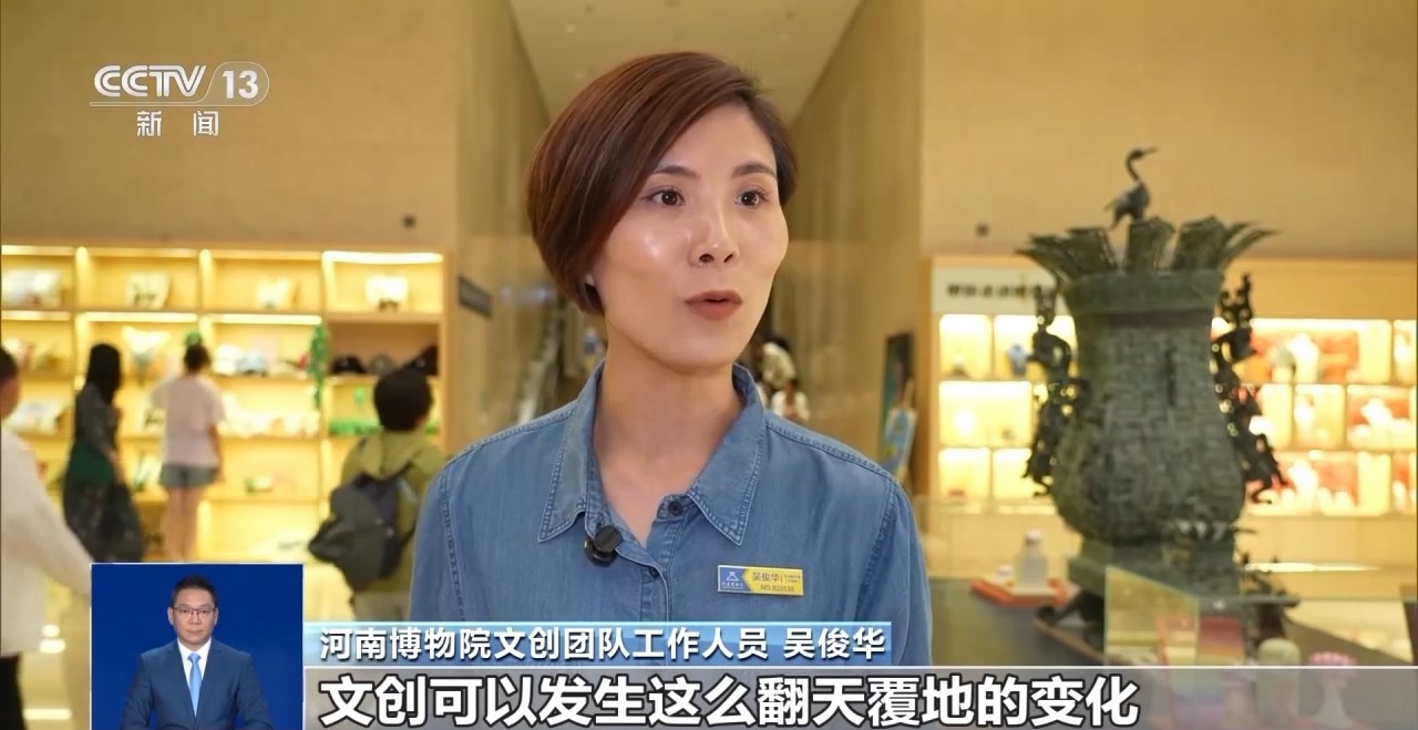 河南博物院文創團隊工作人員 吳俊華:大家來參觀博物館從(cong) 被動灌輸,轉化為(wei) 主動探索、去感受考古挖掘的樂(le) 趣以及文物的魅力。文創可以發生這麽(me) 翻天覆地的變化,文創可以融入大家的衣食住行中。