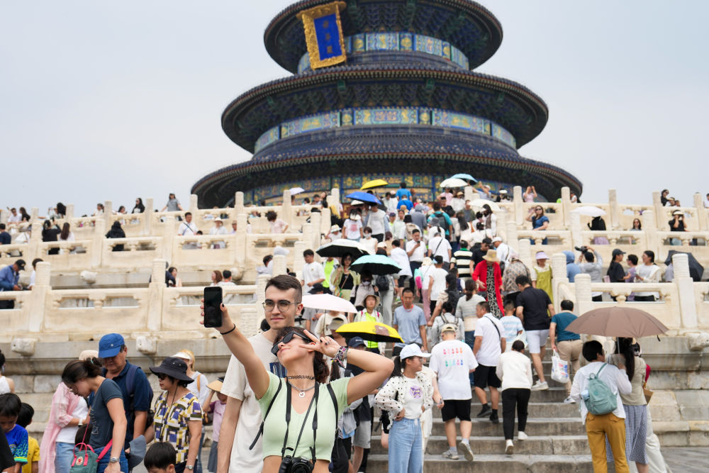 7月9日,兩(liang) 名外國遊客在北京天壇公園祈年殿前自拍合影。新華社記者 鞠煥宗 攝