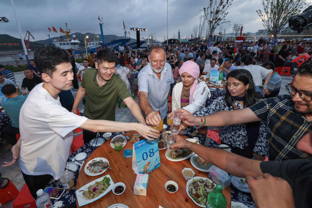 8月23日,遊客在岱山縣長塗鎮舉(ju) 行的海島特色黃魚宴上舉(ju) 杯。新華社記者 徐昱 攝