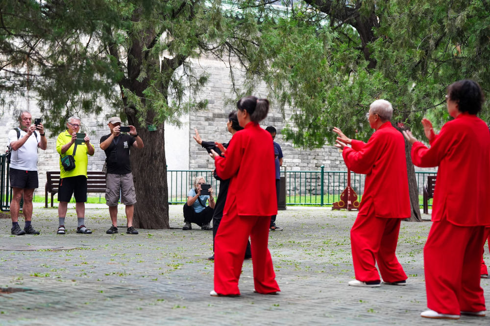 7月2日,在北京天壇公園,幾位外國遊客在觀看太極拳。新華社記者 鞠煥宗 攝