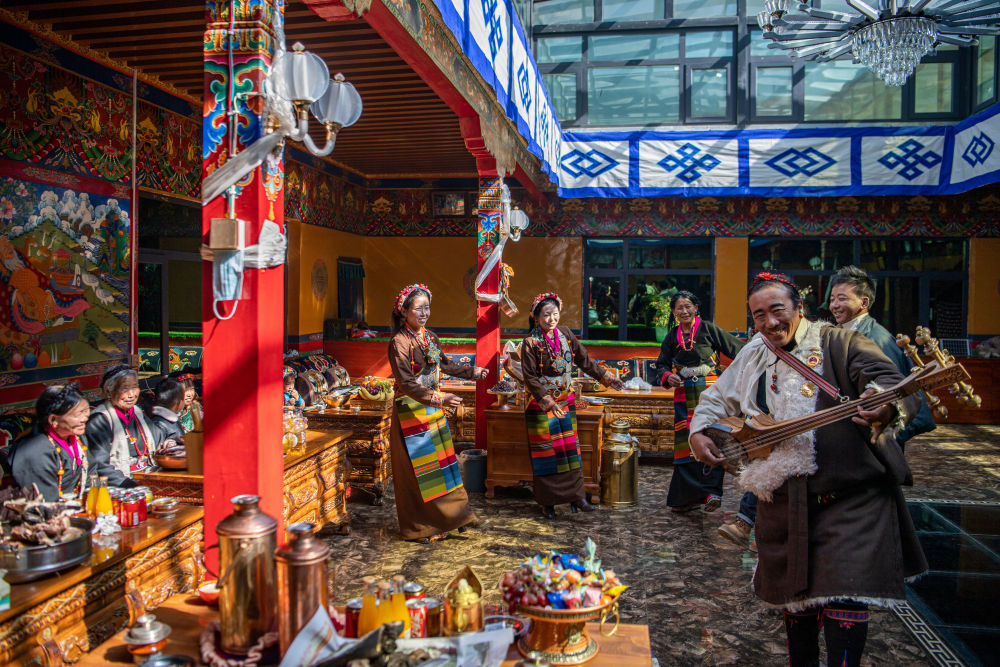 2023年1月22日,在位於(yu) 西藏日喀則拉孜縣紮西宗鄉(xiang) 雜村的家中,次旦老人的兒(er) 孫們(men) 一邊彈紮念琴一邊跳舞,慶祝藏曆農(nong) 家年。新華社記者 孫非 攝