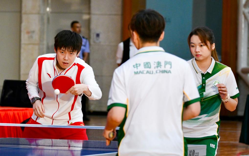 9月1日,乒乓球運動員王楚欽(左)與(yu) 澳門運動員切磋球技。新華社記者 郭雨祺 攝