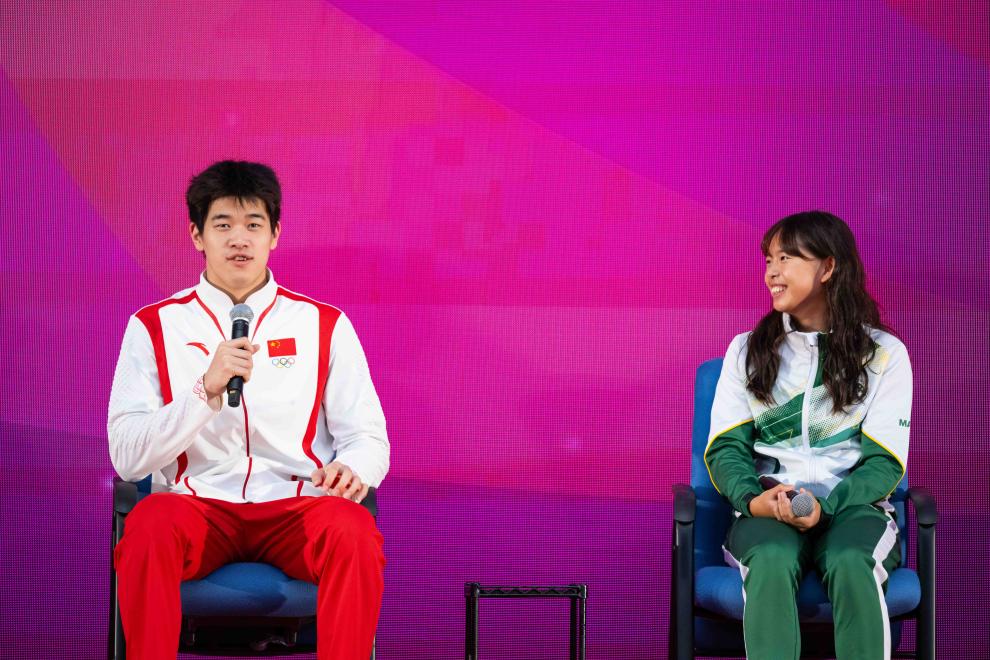 9月1日,遊泳運動員潘展樂(le) (左)在活動中回答澳門運動員的提問。新華社記者 張金加 攝