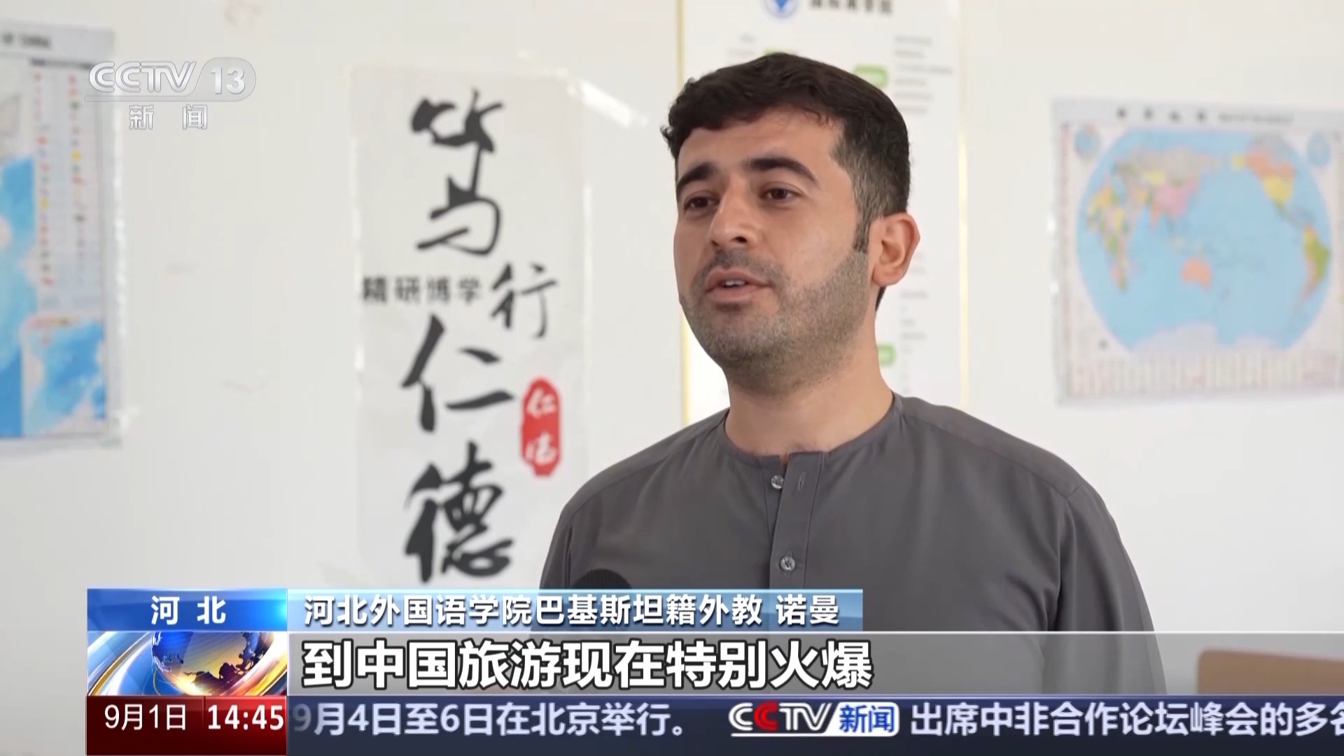 河北外國語學院巴基斯坦籍外教 諾曼:到中國旅遊現在特別火爆,包括巴基斯坦在內(nei) ,許多國家的人都來到中國,愛上了中國的美食和文化,感受這裏各種便捷舒適的生活方式,我身邊還有很多留學生朋友都很享受在這裏的學習(xi) 生活。