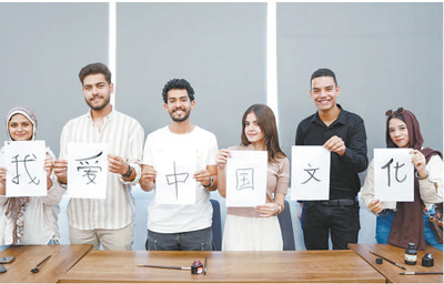 7月3日,埃及中國圖書(shu) 中心揭牌儀(yi) 式在埃及開羅巴德爾大學舉(ju) 辦。圖為(wei) 參加活動的埃及大學生展示書(shu) 法。