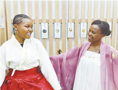 當地時間4月20日,為(wei) 慶祝第十五個(ge) 聯合國中文日,南非德班理工大學孔子學院舉(ju) 辦以“說文解字,以茶會(hui) 友”為(wei) 主題的活動。活動參與(yu) 者身穿中國傳(chuan) 統服飾,共同探討漢字和茶文化。圖為(wei) 兩(liang) 名當地女孩試穿中國傳(chuan) 統服飾。