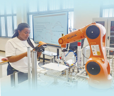 埃塞俄比亞(ya) 魯班工坊由天津職業(ye) 技術師範大學與(yu) 埃塞聯邦職業(ye) 技術培訓學院合作建立,於(yu) 2021年4月揭牌啟運,聚焦人工智能領域,對接當地合作院校的電氣自動化與(yu) 控製技術管理等專(zhuan) 業(ye) 。圖為(wei) 當地學生在操作工業(ye) 機器人。
