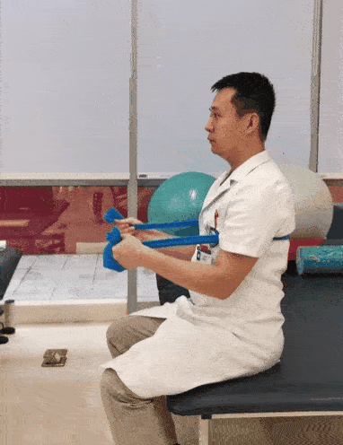 坐位,將彈力帶置於(yu) 身體(ti) 前方,兩(liang) 端纏繞於(yu) 手上。身體(ti) 保持正直,雙手拉動彈力帶,緩慢做水平外展動作,直到彈力帶呈繃緊狀態。然後,還原至初始姿勢。此為(wei) 一個(ge) 完整動作。8~12次/組,做3組。