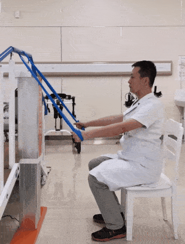 將彈力帶繞過身體(ti) 前方的橫杆等固定物體(ti) ,兩(liang) 端纏繞於(yu) 雙手上。坐位,身體(ti) 保持正直,兩(liang) 手緩慢向下拉動彈力帶,直至彈力帶呈緊繃狀態。然後,緩慢還原至初始姿勢。此為(wei) 一個(ge) 完整動作。8~12次/組,做3組。