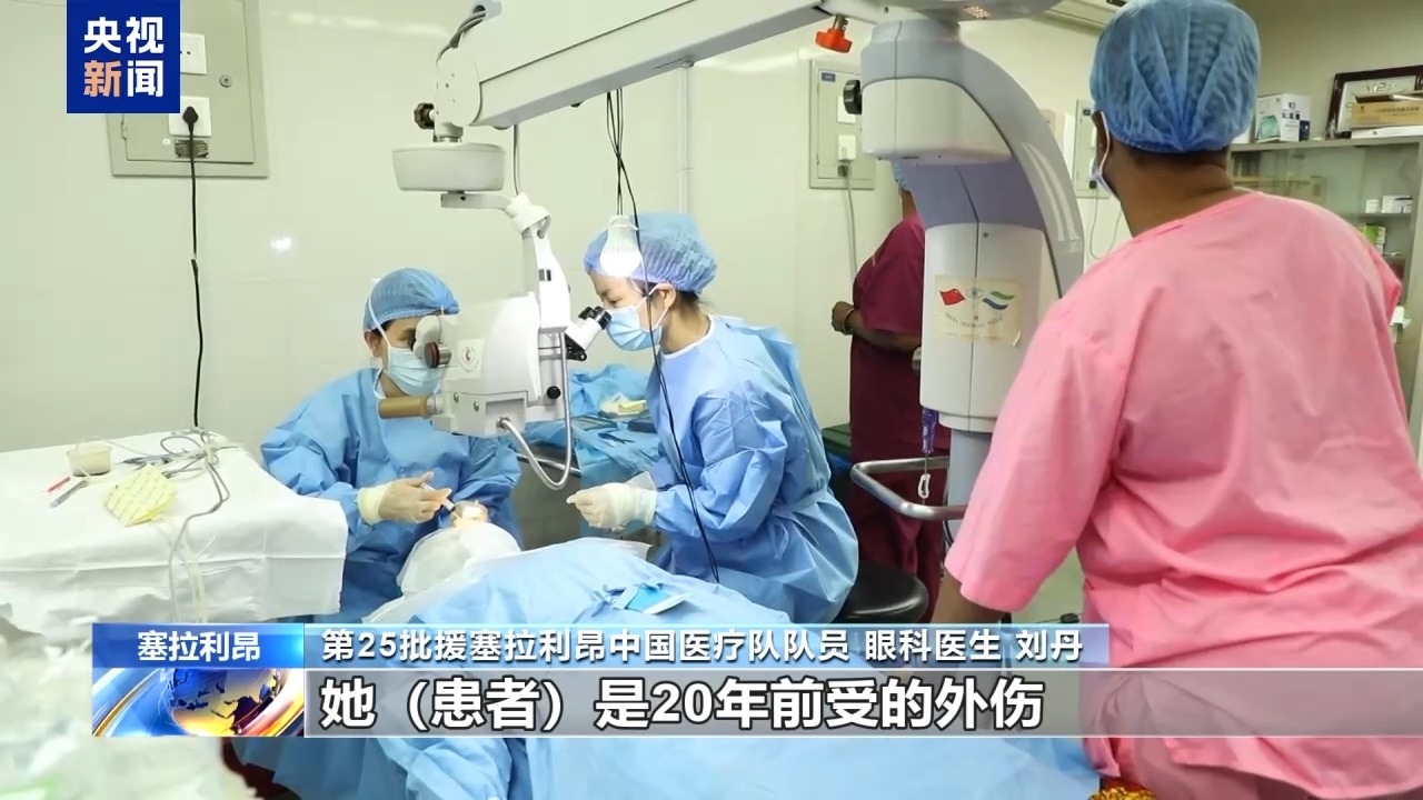 第25批援塞拉利昂中國醫療隊隊員 眼科醫生 劉丹:她(患者)是20年前受的外傷(shang) ,然後角膜帶斑翳,就是虹膜粘連,很難的一個(ge) 白內(nei) 障(手術)。這裏的白內(nei) 障都是好重的,是那種完全看不見的。