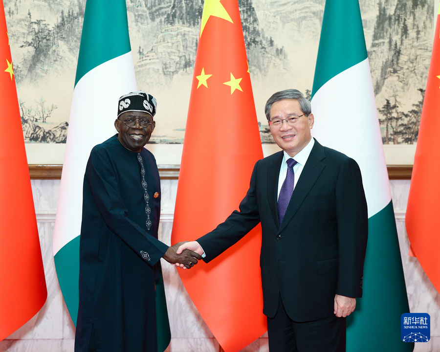 9月4日上午,國務院總理李強在北京釣魚台國賓館會(hui) 見來華出席中非合作論壇北京峰會(hui) 並進行國事訪問的尼日利亞(ya) 總統提努布。新華社記者 劉彬 攝