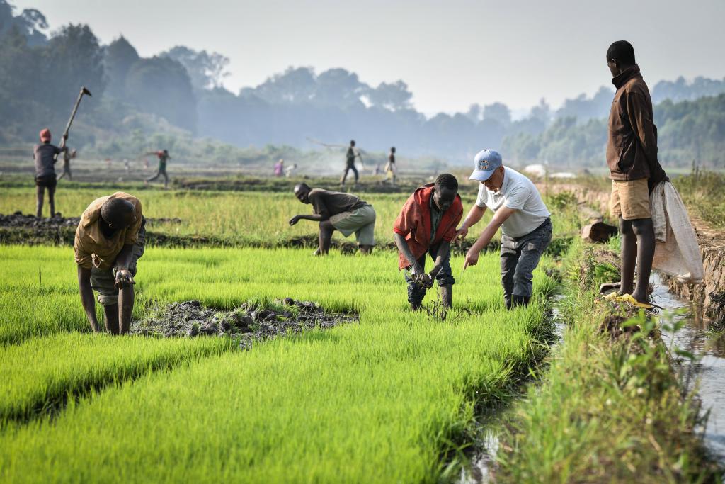 2024年8月14日,在盧旺達南方省胡耶區,水稻專(zhuan) 家鄭瑞金(右二)在稻田裏指導當地稻農(nong) 進行秧苗移栽。新華社記者 韓旭 攝
