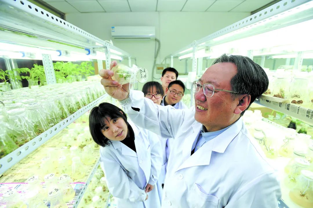 沈陽農(nong) 業(ye) 大學教授李天來院士在實驗室指導研究生開展科研,觀察番茄遺傳(chuan) 轉化過程等情況。