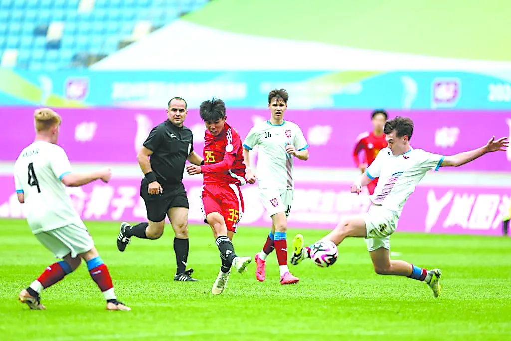 2024年國際中學生體(ti) 育聯合會(hui) 足球世界杯在遼寧省大連市舉(ju) 行,中外球員角逐綠茵場。 遼寧省教育廳供圖