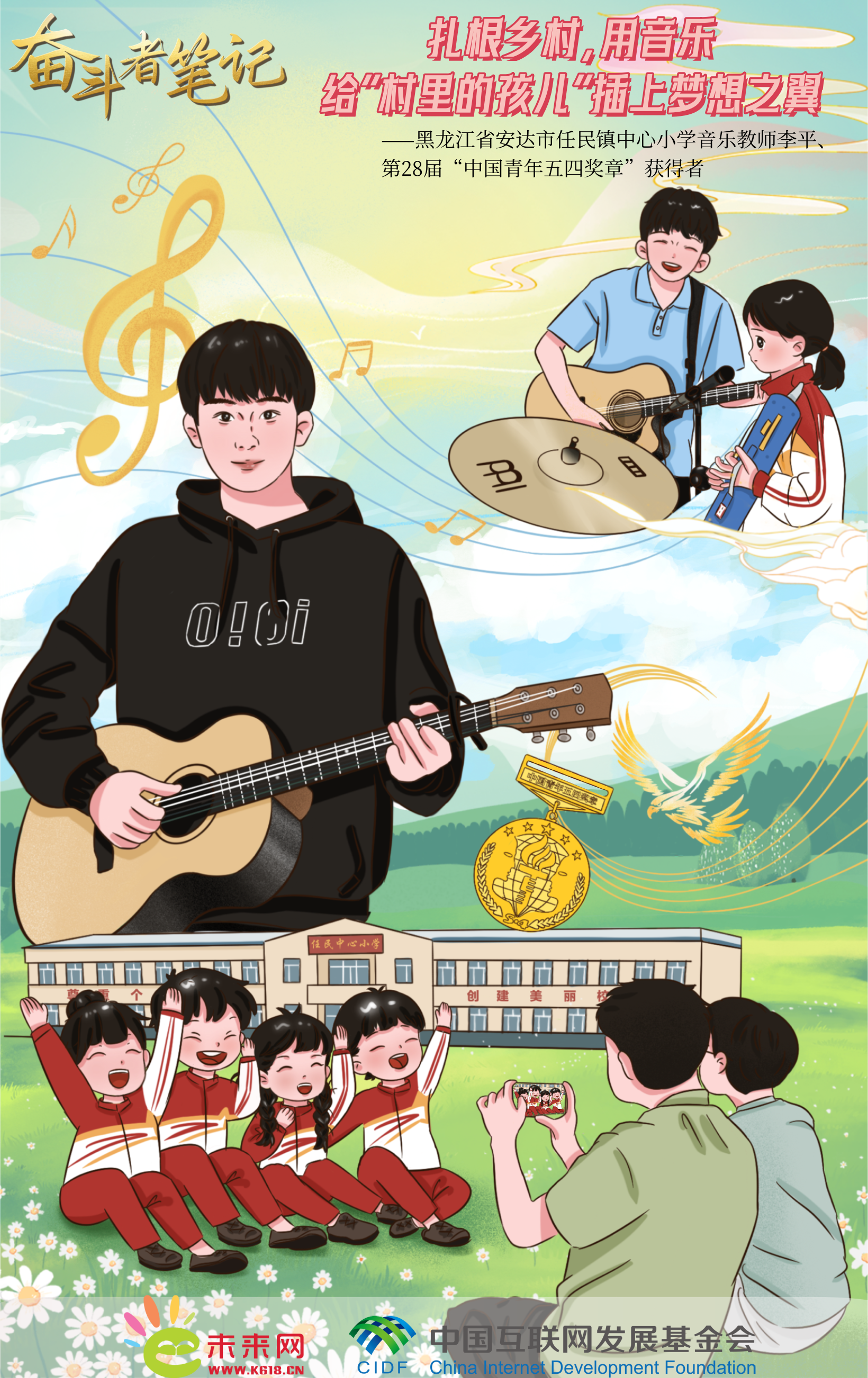 隨著新學期的到來,黑龍江省安達市任民鎮中心小學又傳(chuan) 來了孩子們(men) 悠揚的歌聲,“90後”音樂(le) 教師李平正帶著他的音樂(le) 班學生沉浸在音樂(le) 的海洋之中。自2016年入職任民鎮中心小學至今,李平從(cong) 一名音樂(le) 教育專(zhuan) 業(ye) 的畢業(ye) 生逐漸成長為(wei) 擁有“百萬(wan) 粉絲(si) ”的網絡紅人,從(cong) 一名普通的鄉(xiang) 村教師成長為(wei) 了第28屆“中國青年五四獎章”獲得者。李平的進步與(yu) 收獲有目共睹,“村裏的孩兒(er) ”音樂(le) 班也逐漸成為(wei) 越來越多人矚目的焦點。