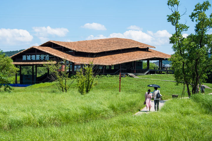 2024年7月4日,遊客在杭州良渚古城遺址公園南城牆遺址展示點遊覽。 新華社記者 江漢 攝