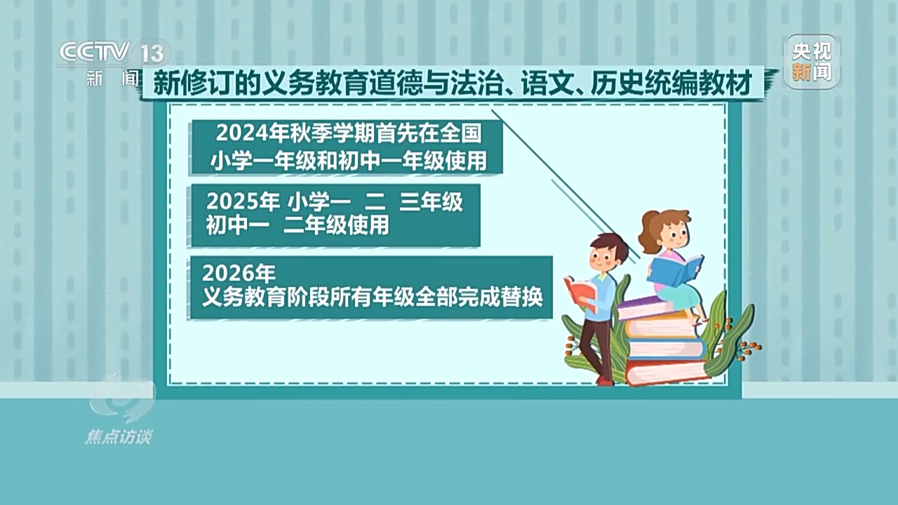 今年秋季學期,修訂後的教材在小學一年級和初中一年級投入使用;2025年,小學一、二、三年級和初中一、二年級使用;2026年,義(yi) 務教育階段所有年級全部完成替換。