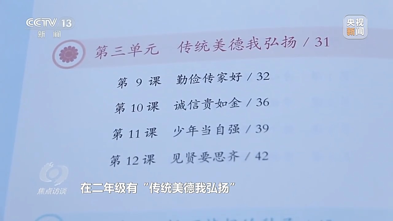義(yi) 務教育道德與(yu) 法治統編教材編委會(hui) 主任 孫蚌珠:為(wei) 了讓學生循序漸進地了解中華優(you) 秀傳(chuan) 統文化,堅定文化自信,在二年級有“傳(chuan) 統美德我弘揚”,四年級有“博大精深的中華優(you) 秀傳(chuan) 統文化”,七年級有“傳(chuan) 承中華優(you) 秀傳(chuan) 統文化”,這樣層層遞進。