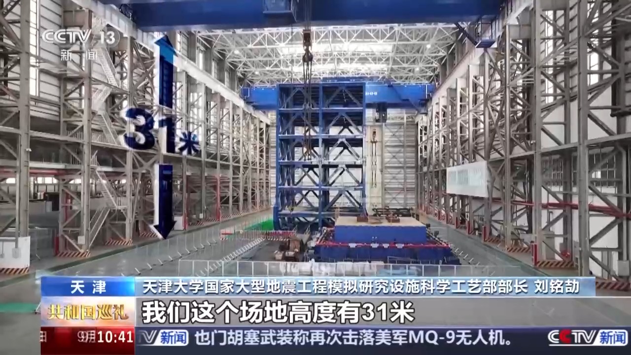 天津大學國家大型地震工程模擬研究設施科學工藝部部長 劉銘劼:我們(men) 這個(ge) 場地高度有31米,跨度有43米,這部分區域的長度是120米。我們(men) 這個(ge) 振動台台麵尺寸20米乘16米,最大載重1350噸,大概是二十多輛重載卡車的重量。我們(men) 在滿載情況下可以運行的最大加速度是2.0個(ge) 重力加速度。這麽(me) 大的加速度實際上已經超過了我們(men) 9度烈度條件下的地震動的水平。