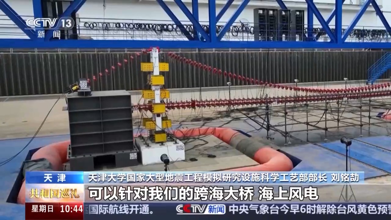 天津大學國家大型地震工程模擬研究設施科學工藝部部長 劉銘劼:我們(men) 這裏麵是世界上唯一的一套,可以實現水下雙台地震、波浪、水流聯合模擬的一個(ge) 試驗裝置,可以在3米水深下工作,可以針對我們(men) 的跨海大橋、海上風電這些海上“超級工程”進行更加真實的地震模擬研究。