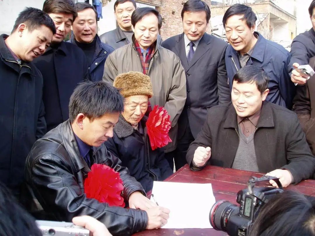 2005年1月5日,丹江口市三官殿辦事處馬灣村村民王瑞權(左一)與(yu) 辦事處負責人簽訂搬遷合同,成為(wei) 南水北調中線工程移民搬遷第一戶。(湖北日報通訊員 陳華平 攝)