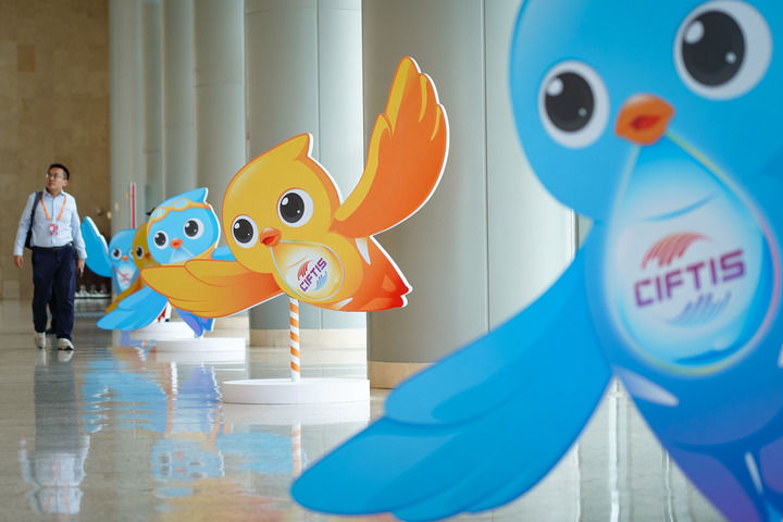 2024年9月11日在國家會(hui) 議中心拍攝的服貿會(hui) 吉祥物“福燕”形象。新華社記者 陳鍾昊 攝
