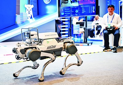 網絡安全博覽會(hui) 上的企業(ye) 展示電網巡線機器狗。新華社記者 鄧華攝