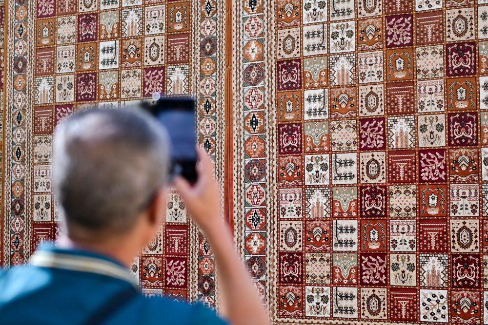 步入龜茲(zi) 小巷,一幅巨大的地毯牆首先映入眼簾,地毯上大大小小的方格整齊排列,圖案精美對稱、色彩豔麗(li) 。地毯是新疆少數民族家庭中最常見的裝飾品,一般以羊毛剪裁編織而成,集繪畫、雕刻、編織、刺繡、印染等手工技藝於(yu) 一體(ti) ,是展現新疆民族風情的典型物品之一。