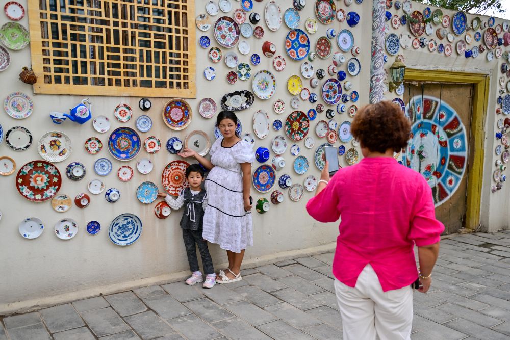 遊客在新疆庫車市龜茲(zi) 小巷拍照留念。新華社記者 丁磊 攝
