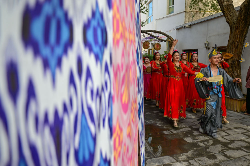 在新疆庫車市龜茲(zi) 小巷,樂(le) 舞表演團隊在小巷巡演。新華社記者 丁磊 攝