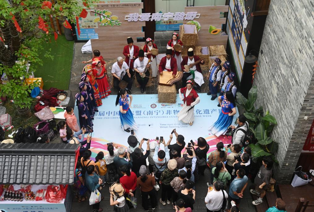 今年“三月三”期間,在南寧市三街兩(liang) 巷的慶祝活動現場,多彩非遺文化展演吸引遊客駐足欣賞。新華社記者陸波岸 攝
