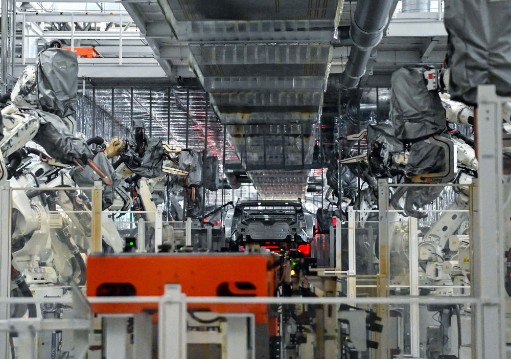 8月5日,在位於(yu) 吉林省長春市一汽紅旗製造中心繁榮廠區的焊裝車間內(nei) ,焊裝機器人在生產(chan) 線上焊接車身。新華社記者 顏麟蘊 攝