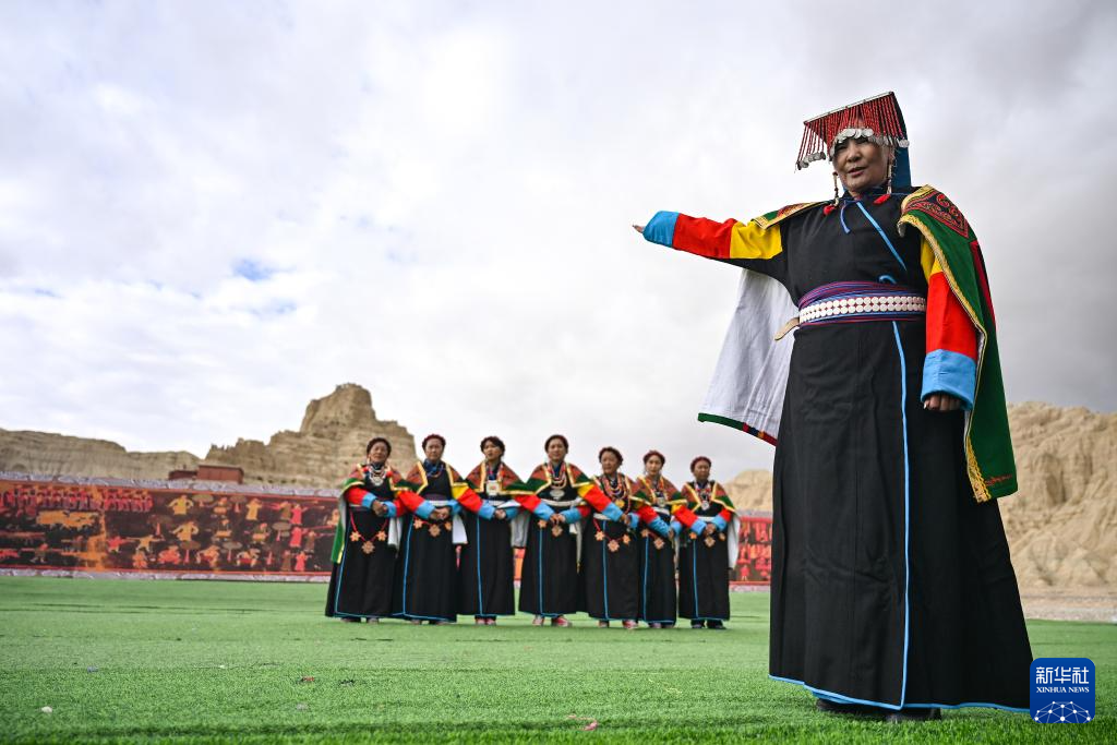 在西藏阿裏地區劄達縣古格王國遺址腳下,當地村民表演“宣舞”(9月11日攝)。