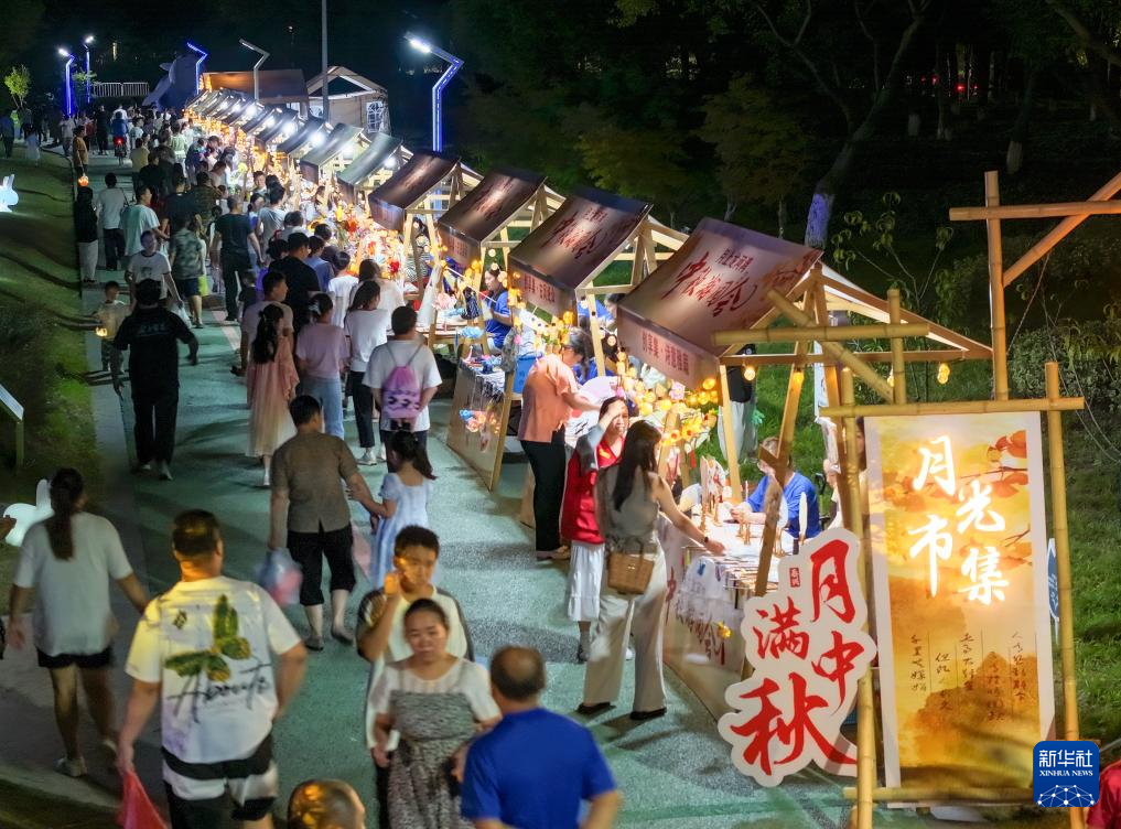 9月15日,遊客在江蘇省泰興(xing) 市龍河灣公園逛“月光市集”(無人機照片)。