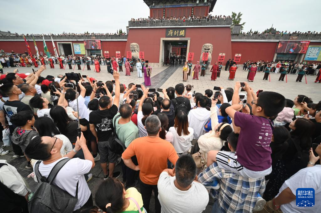 9月16日,遊客在河南省開封市開封府門前觀看《開衙迎賓》儀(yi) 式。