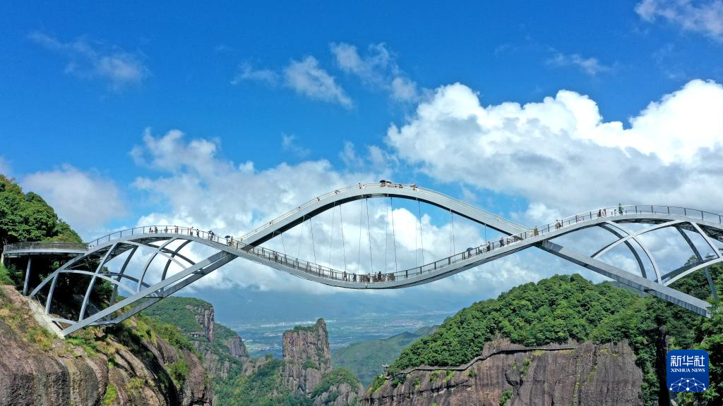 9月17日,遊客在浙江省台州市仙居縣神仙居景區如意橋上遊玩(無人機照片)。