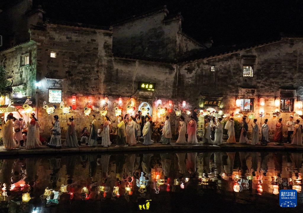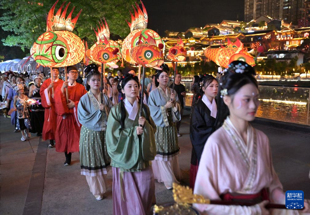 9月16日晚,在湖北省宣恩縣城貢水河畔,人們(men) 身著傳(chuan) 統服飾參加巡遊活動。