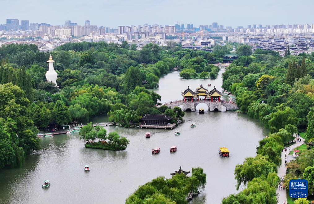 9月17日,遊客在江蘇揚州瘦西湖風景區遊玩(無人機照片)。