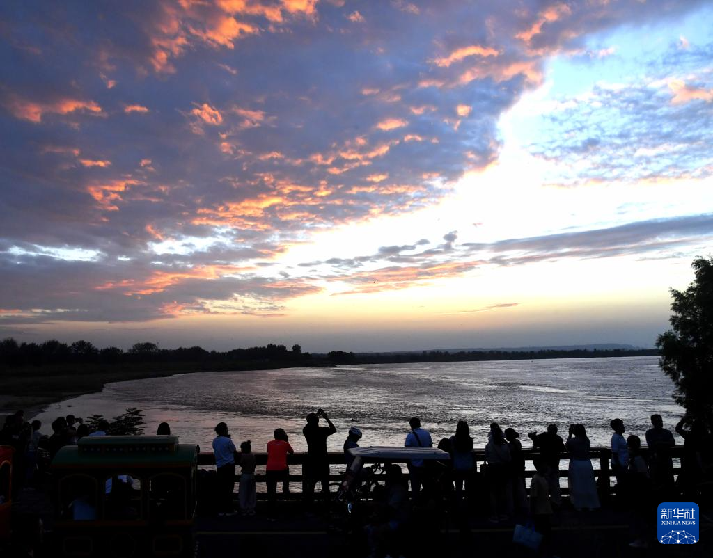 9月17日,鄭州黃河南裹頭廣場,遊客觀賞晚霞。