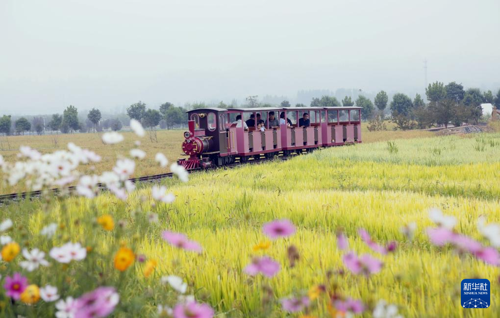 9月15日,在河南省洛陽市汝陽縣三屯鎮東(dong) 保村“稻田小鎮”,遊客乘坐小火車在稻田旅遊觀光。