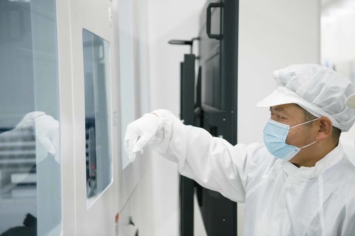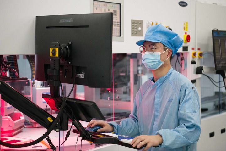 8月20日,工作人員在安徽華晟新能源科技股份有限公司的異質結光伏電池及組件工廠內(nei) 作業(ye) 。