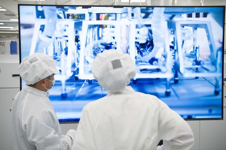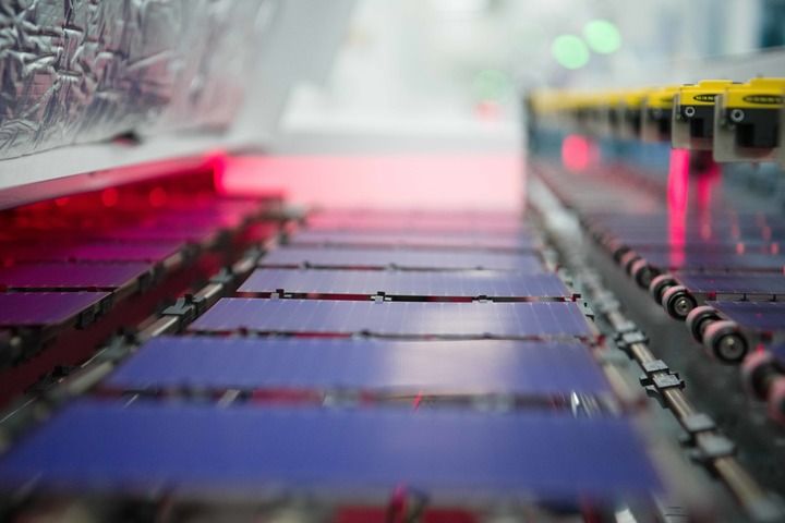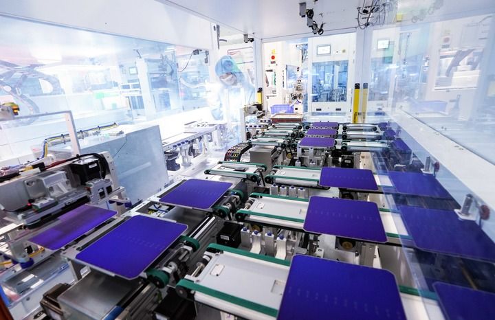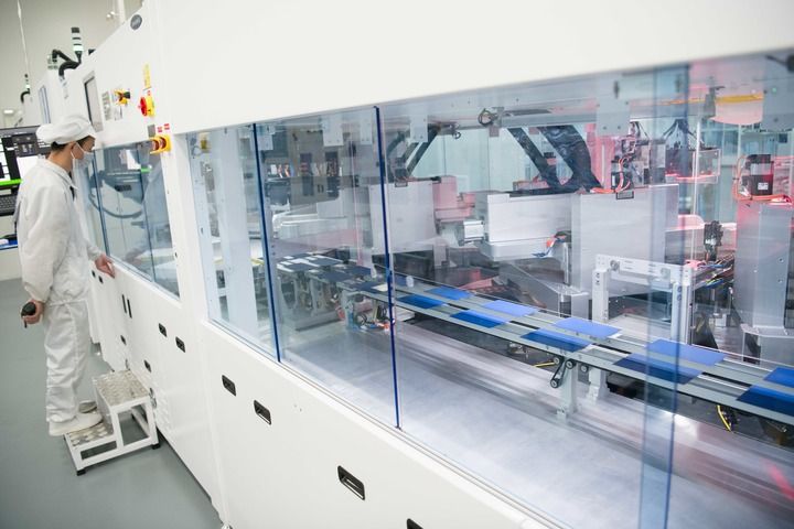 安徽合肥,全球單體(ti) 產(chan) 能最大的異質結光伏電池及組件一體(ti) 化工廠,工業(ye) 機器人將一個(ge) 個(ge) 矽片投送到一架白色機器的腔體(ti) ,經過綿延的智能化流水線,狀如手機大小、薄如紙片的光伏電池片便下線了。