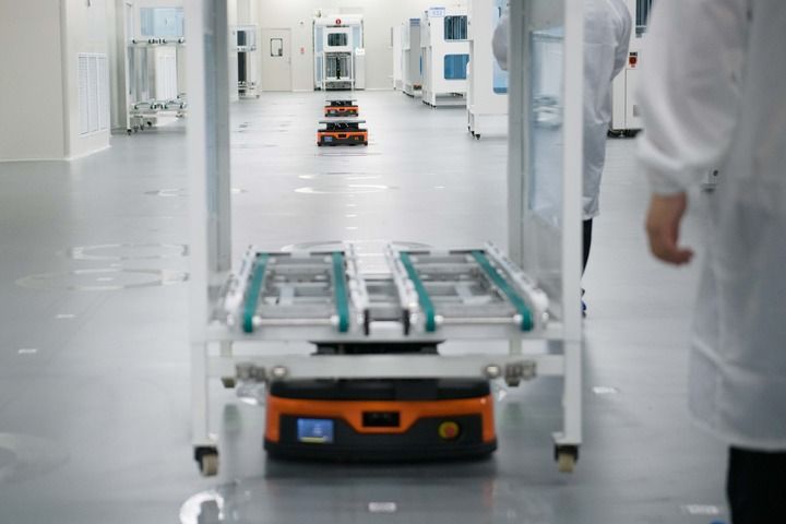 8月20日,在安徽華晟新能源科技股份有限公司的異質結光伏電池及組件工廠內(nei) ,搬運機器人在作業(ye) 中。