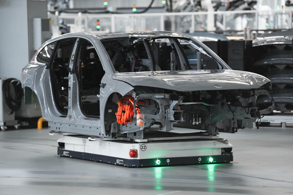 這是在安徽省合肥市新橋智能電動汽車產(chan) 業(ye) 園蔚來第二工廠拍攝的新能源汽車生產(chan) 線(2024年5月9日攝)。新華社記者 張端 攝