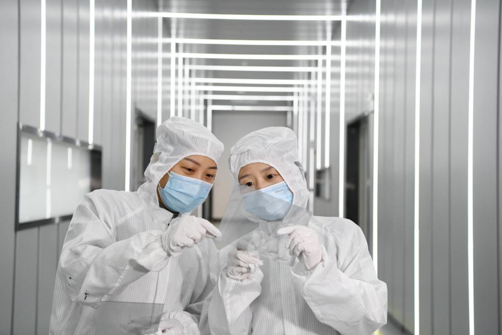 2月21日,在位於(yu) 安徽合肥的東(dong) 超科技工廠,技術人員在檢查負折射平板透鏡原材料的品質。新華社記者 張端 攝