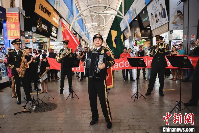 當地時間9月21日,巴西首都巴西利亞(ya) ,參加中國軍(jun) 事文化周活動的中國人民解放軍(jun) 軍(jun) 樂(le) 團演出分隊,正在巴西利亞(ya) 小商品市場演出。琚振華 攝