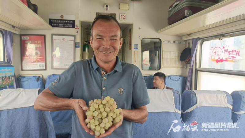 車廂內(nei) 頓時一片歡騰,“石榴姐妹”“無花果大哥”“核桃兄弟”紛紛打開袋子和紙箱,請旅客們(men) 挑選。