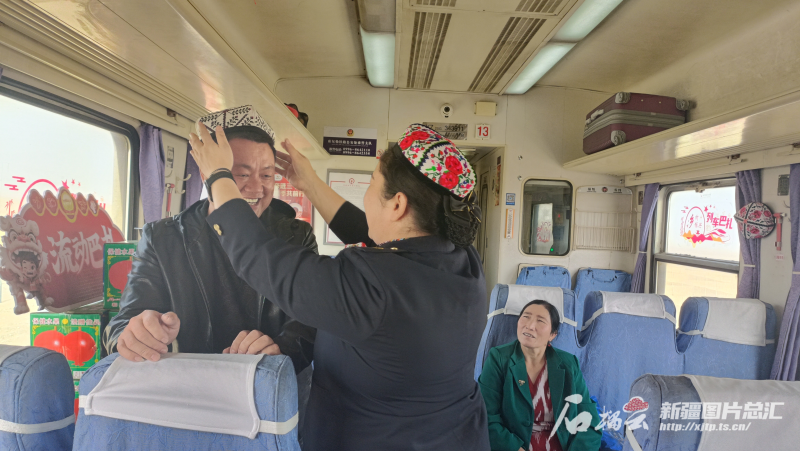 9月23日,7558次列車巴紮上,列車員瑪依然·賽買(mai) 提給來新疆旅遊的乘客戴上了一頂小花帽。石榴雲(yun) /新疆日報記者 宋衛國攝
