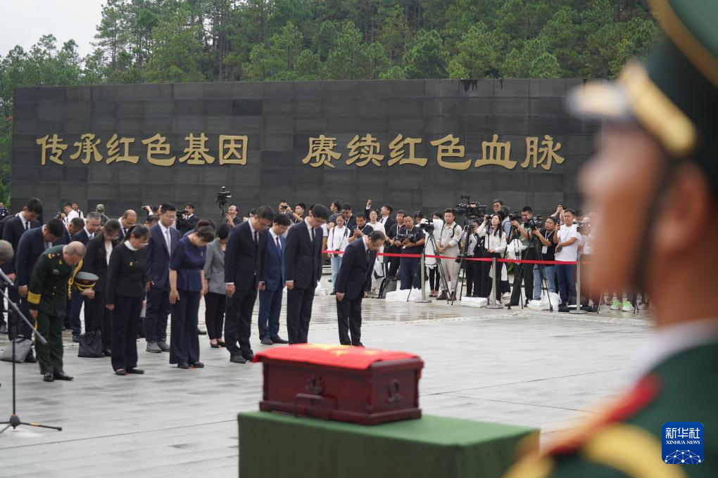 棺槨入土安葬後,18名禮兵將9個(ge) 花籃敬獻至烈士墓碑前。在場人員依次向烈士獻花致敬,並瞻仰烈士紀念牆。